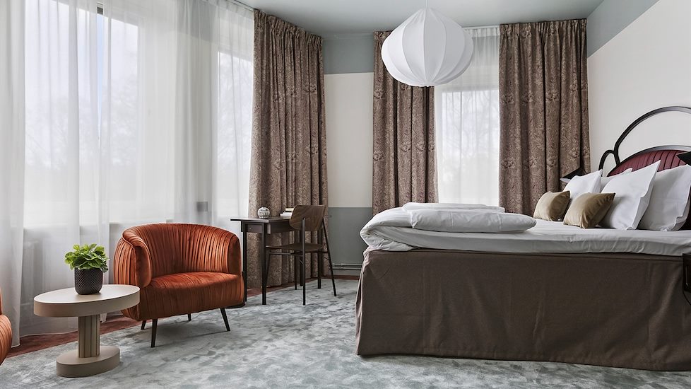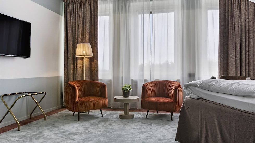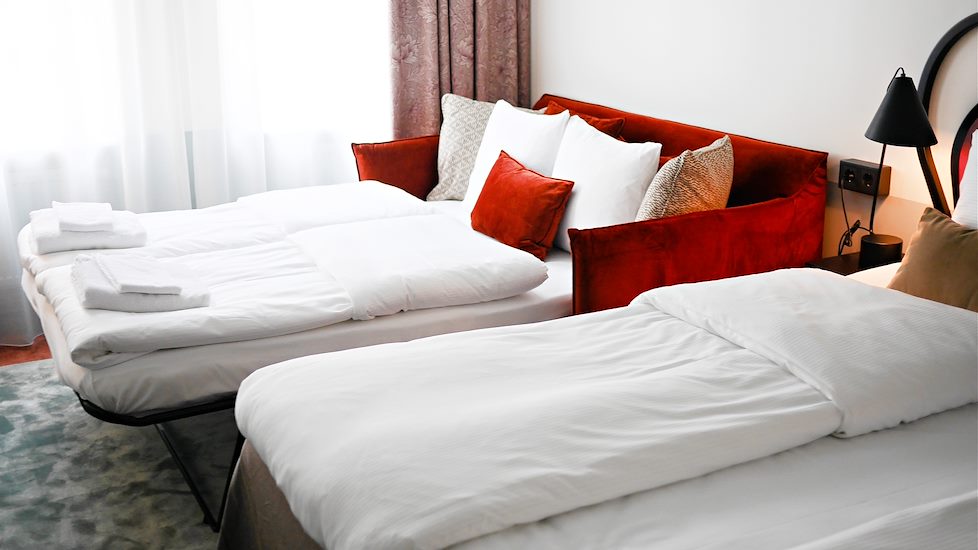 För 1-4 personer. Twinbed (180 cm bred med separata madrasser), bäddsoffa/sängskåp, fåtölj, skrivbord, safebox, 49” tv, hårfön, skohorn, strykjärn, strykbräda, garderob, minibar med snacks, godis samt drycker.