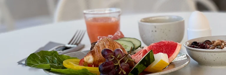 Frukostbuffén bjuder på allt från croissanter till färsk frukt och pannkakor. Naturligtvis finns bröd, skinka, leverpastej, ostar, grönsaker, ägg, äggröra, bacon, fruktshots, yoghurt och fil, müslivarianter, flingor, olika juicer, dessertostar, ekologiskt te och mycket, mycket mer. Vi har alltid veganska produkter och ett stort sortiment av gluten- och laktosfria inslag, känner du dig osäker så prata med vår frukostpersonal. Maj-september kan våra gäster äta sin frukost utomhus på vår sköna terrass.