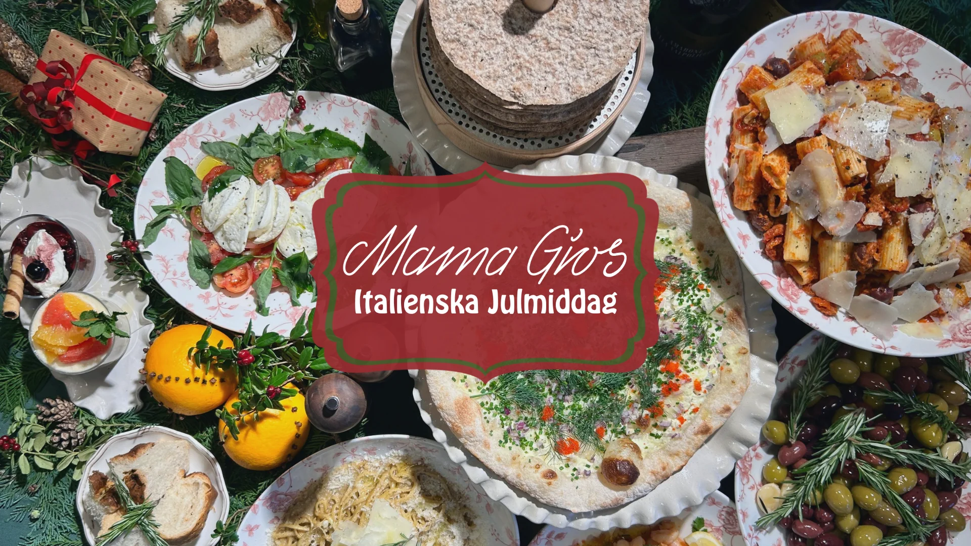 Mama Giòs tiramisú, torta al cioccolato, crema bruciata e rosmarino Färsk frukt, julgodis och kanderade mandlar