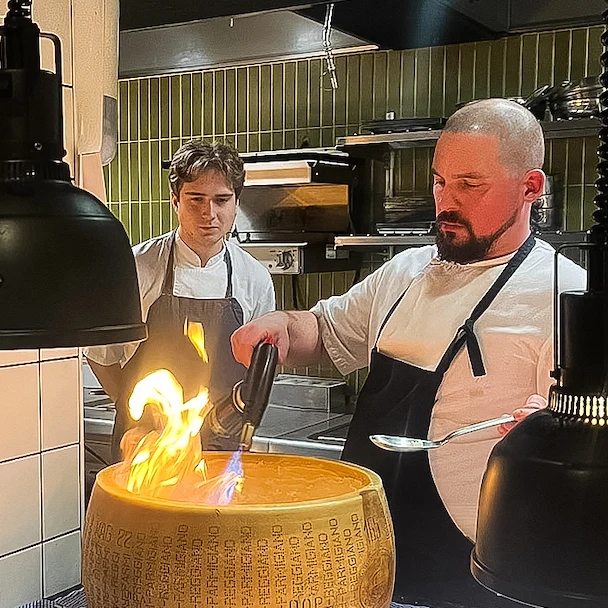 Färsk tagliolini serveras ur vårt parmesanhjul