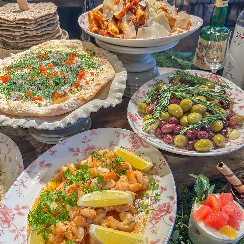 Mortadella, coppa, marinerad fläskfilé med soltorkade tomater och basilika, Mama Giòs råbiff med tryffelkräm, marinerade oliver, vitlöksbröd, kronärtkockskräm, tapenade, pizza alla Siciliana, panzanella och fritto misto